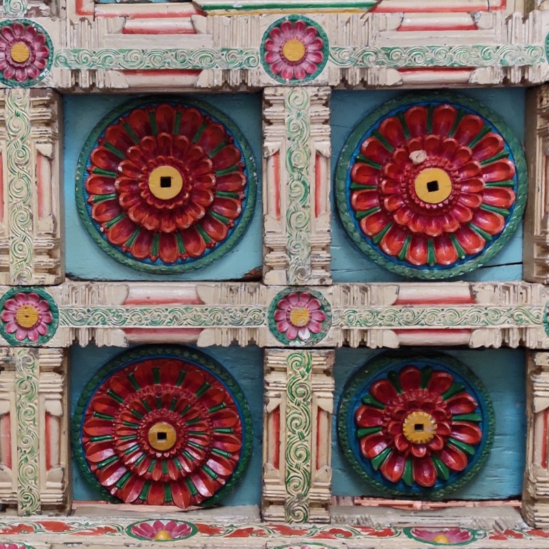 While the Shri Narayan temple presents extraordinarily old columns from where all carving almost disappeared, in the Shri Betal temple we observe the proportions and carved decorations that are seen in all the other wooden temples. (Fig. 2) Robust in appearance, the columns are divided into two sections: the shaft, decorated with pipal leaves in several rings framing high reliefs with scenes taken from the Ramayana; and the capital, in a round shape of a multitude of naga (serpent) held by chains.[2] Above the capital of each column, four arms forming a cross allow a junction between the columns and the roof structure, and are carved as stylised bunches of banana flowers. The beams that connect the columns and support the roofing are carved with high-relief rosettes.