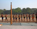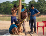 Among Mr Ulagadurai’s former students, Janardhanan, Ganesh, Ramachandran and Prakash played an important role in spreading the game in Tamil Nadu. Today, one-third of athletes representing Tamil Nadu for the national competition are from Tamizhan Mallakhamb Sports Academy (TMSA) run by Mr Prakash. Like his guru, he teaches for free. In order to save money on training equipment, he recycles scrap. ‘A full-size mallakhamb costs Rs. 25,000. If I make it on my own, I can save Rs. 7,000. A cushioned mat would cost Rs. 3,000. I can make it with scraps in less than Rs. 2,000,’ he says. Prakash works as a constable in the Railway Protection Force (RPF), and his contribution and dedication in developing the game are selfless. He is helped by the seniors at TMSA, who spend most of their time coaching youngsters. Their humility and discipline in truly inspiring.