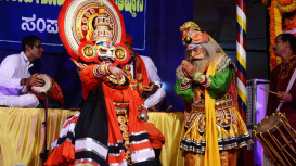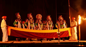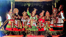 A performing art form from Karnataka, Yakshagana is a heady combination of dance, music, costume and make-up, and drama. Traditionally performed on an open air-stage set up in the village, against the backdrop of flickering oil-lamps and flitting shadows, Yakshagana mesmerizes the audience and transports them to a world of beauty, romance, violence and pathos. It is probably one of the most exuberant and colourful of India's folk theatres.